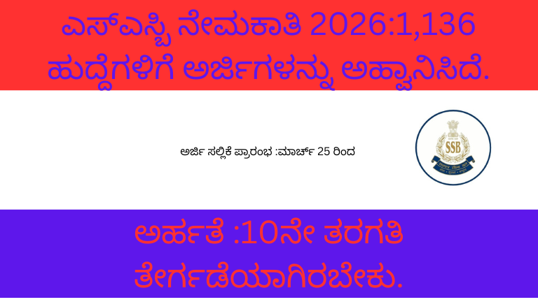 Huddea ಹೆಸರು :-ಸಶಸ್ತ್ರ ಸೀಮಾ ಬಲ ಕಾನ್ಸ್ಟೇಬಲ್ ಹುದ್ದೆಗಳು ಪುರುಷ ಮತ್ತು ಮಹಿಳೆ ಹುದ್ದೆಗಳ ಸಂಖ್ಯೆ :-1,136 ಹುದ್ದೆಗಳು ವಿದ್ಯಾರ್ಹತೆ :- ಹತ್ತನೇ ತರಗತಿ ಅಥವಾ ದ್ವಿತೀಯ ಪಿಯುಸಿ ಪಾಸಾಗಿರಬೇಕು ಮತ್ತು ಹುದ್ದೆಗೆ ಸಂಭಂದಿಸಿದ ಕೋರ್ಸ್ ಪಾಸಾಗಿರಬೇಕು. ವಯಸ್ಸಿನ ಮಿತಿ :- ಸಾಮಾನ್ಯ ವರ್ಗ :18ರಿಂದ 27ವರ್ಷ ಒಬಿಸಿ ಅಭ್ಯರ್ಥಿಗಳಿಗೆ 03ವರ್ಷ ಸಡಿಲಿಕೆ ಎಸ್ಸಿ /ಎಸ್ಟಿ ಅಭ್ಯರ್ಥಿಗಳಿಗೆ 5ವರ್ಷ ಸಡಿಲಿಕೆ ಅರ್ಜಿ ಶುಲ್ಕ :- ಸಾಮಾನ್ಯ ವರ್ಗ /ಒಬಿಸಿ ಅಭ್ಯರ್ಥಿಗಳಿಗೆ : ರೂ 100. SC/ST/ಮಾ. ಸೈ ಶುಲ್ಕ ವಿನಾಯಿತಿ ನೇಮಕಾತಿ ವಿಧಾನ :-ನೇಮಕಾತಿ ಪ್ರಕ್ರಿಯೆಯು ಧೈಹಿಕ ಪರೀಕ್ಷೆ ಕಂಪ್ಯೂಟರ್ ಆಧಾರಿತ ಸ್ಪರ್ಧಾತ್ಮಕ ಪರೀಕ್ಷೆ. ವೈದ್ಯಕೀಯ ಪರೀಕ್ಷೆ ಇರುತ್ತದೆ. ಅರ್ಜಿ ಸಲ್ಲಿಸುವ ವಿಧಾನ :-ಅಧಿಕೃತ ವೆಬ್ಸೈಟ್ ಪ್ರವೇಶಿಸಿ ಆನ್ಲೈನ್ ಮೂಲಕ ಅರ್ಜಿ ಸಲ್ಲಿಸಬಹುದು. ಅರ್ಜಿಸಶಸ್ತ್ರ ಪ್ರಾರಂಭ ದಿನಾಂಕ :-21ಮಾರ್ಚ್ 2026 ಅರ್ಜಿ ಕೊನೆಯ ದಿನಾಂಕ :-20ಏಪ್ರಿಲ್ 2026 ಅಧಿಸೂಚನೆ :- ಕಾನ್ಸ್ಟೇಬಲ್ ಟ್ರೇಡಮನ್ -827ಹುದ್ದೆಗಳು ಹೆಡ್ ಕಾನ್ಸ್ಟೇಬಲ್ -233ಹುದ್ದೆಗಳು ಹೆಡ್ ಕಾನ್ಸ್ಟೇಬಲ್ ಮೆಡಿಕಲ್ -76ಹುದ್ದೆಗಳು ವೆಬ್ಸೈಟ್ :- https://ssb.gov.in/recruitment/